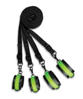 The bindings and cuffs feature fluorescent green detailing that will illuminate in the dark, adding a playful edge to your adventures once the lights go out. Easy to set up and use, these restraints are splashproof, phthalate-free, and designed for ultimate comfort and durability. Activate the glow-in-the-dark effect by exposing the kit to sunlight before use.